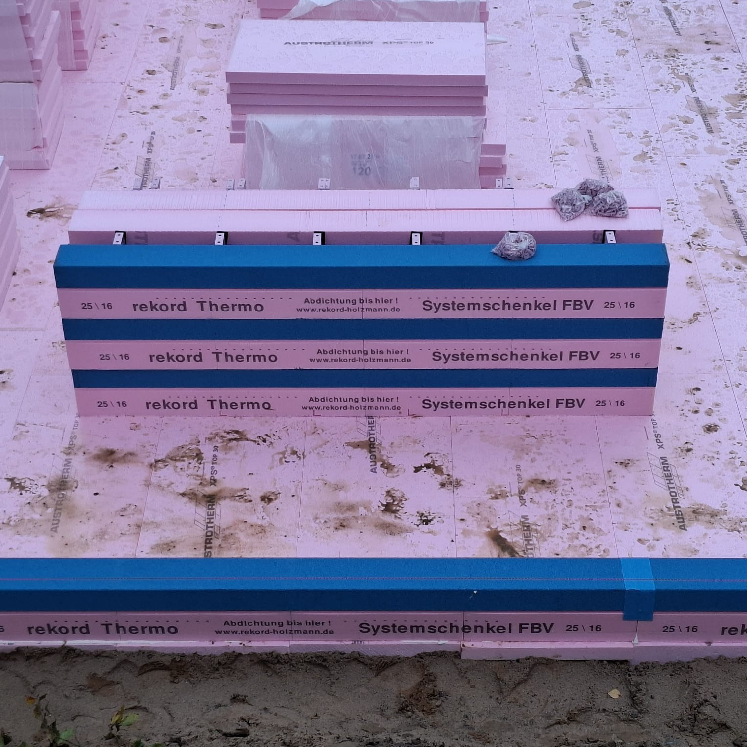 Auf dieser Baustelle kam unsere gedämmte Bodenplattenschalung Thermo zum Einsatz. Ergänzt wurde sie durch vorkonfektionierte verlorene Systemschenkel Thermo FBV. Die FrischBetonVerbund-Dichtbahn liegt auf der betonzugewandten Seite und wird verschraubt.