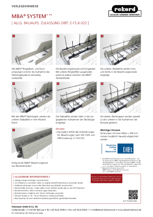 * Das MBA® System (Kurzform von rekord Ringbalken- und Sturzschalung mit MBA® Steckbügelsystem) besteht aus der rekord Ringbalken- und / oder Sturzschalung MBA® und der rekord Bewehrungskonsole. (Die rekord Bewehrungskonsole ist ein „handlicher“ Bewehrungskorb im Stecksystem.)